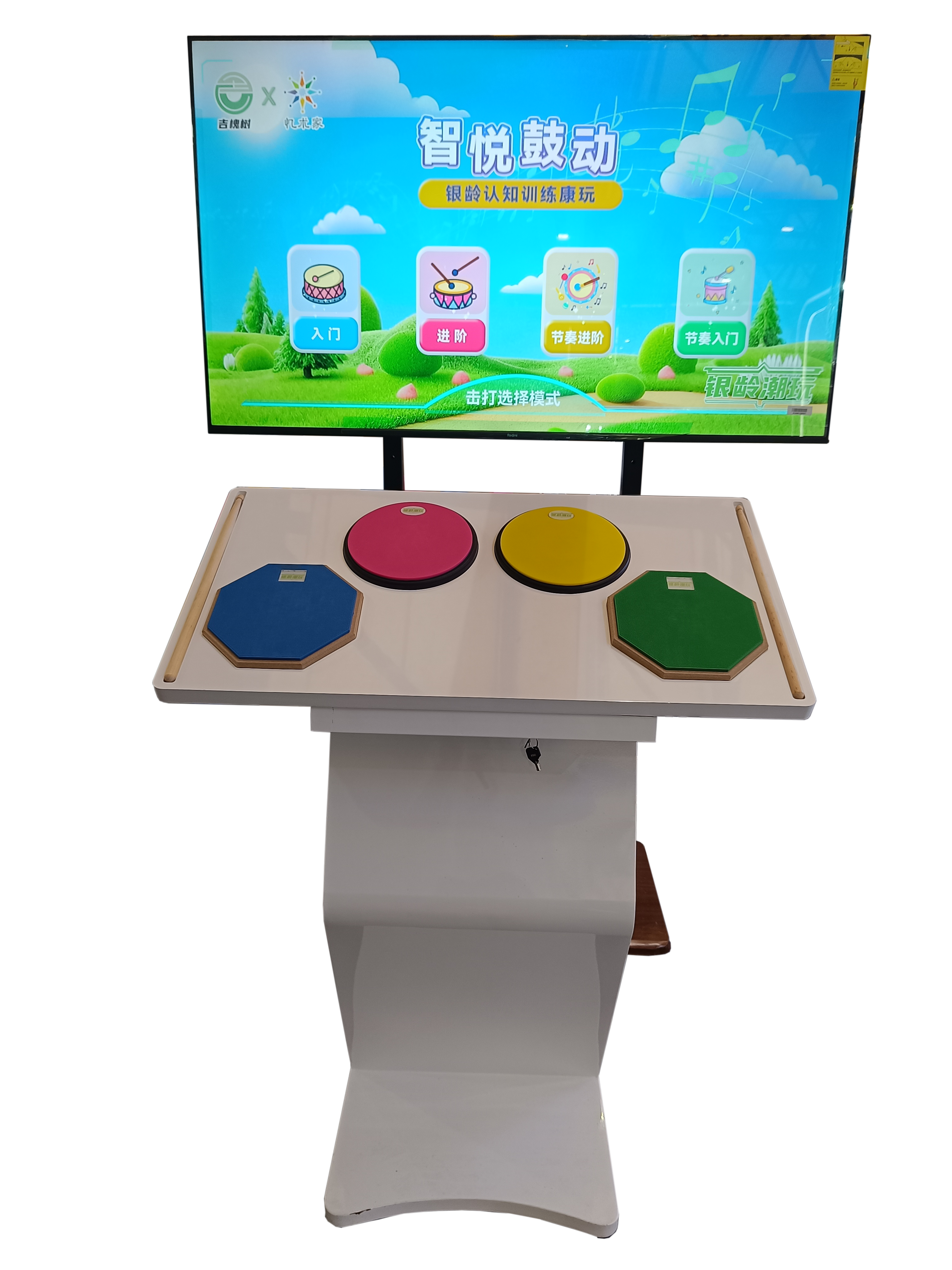 系统组成:智悦鼓动音乐节奏训练系统主机(包含游戏及数据采集分析),鼓架(含4个鼓面)。台面可手摇升降,台面角度可调节。显示设备;55寸智能电视;敲击鼓面操作台82.5*43.3cm,斜面最低高度为79cm,最高高度为100cm,四块鼓面直径20cm,鼓棒40cm。硬件:硬件: